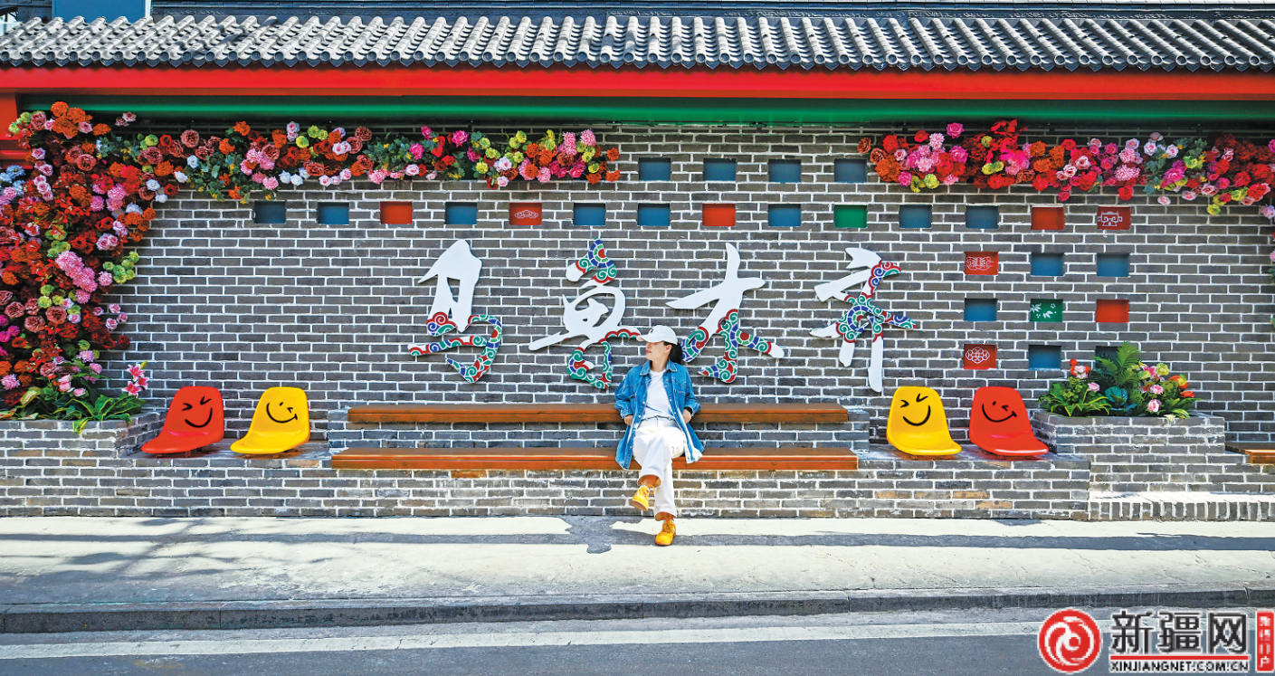 永和巷两侧商铺的中式仿古建筑门头与巷口的玫瑰花墙相映成趣,迎风招展的红旗和绘有特色纹样的“乌鲁木齐”主题文化墙,将老巷道的历史感与新时代的鲜活气息揉成一幅流动的生活画卷。