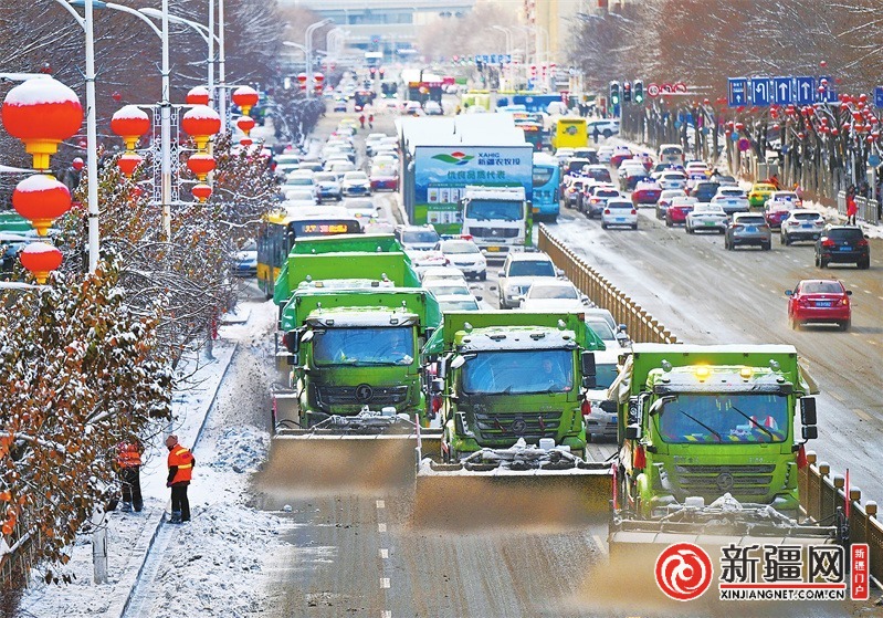 新疆网讯 22日,乌鲁木齐市迎来一场降雪,全市各环卫作业单位及时上路清雪,护航市民安全出行。