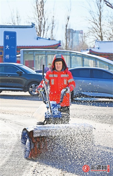 图为12月22日,在西大桥,环卫工人使用小型清雪设备清扫路面积雪。 (记者迪丽娜尔·加力肯摄)