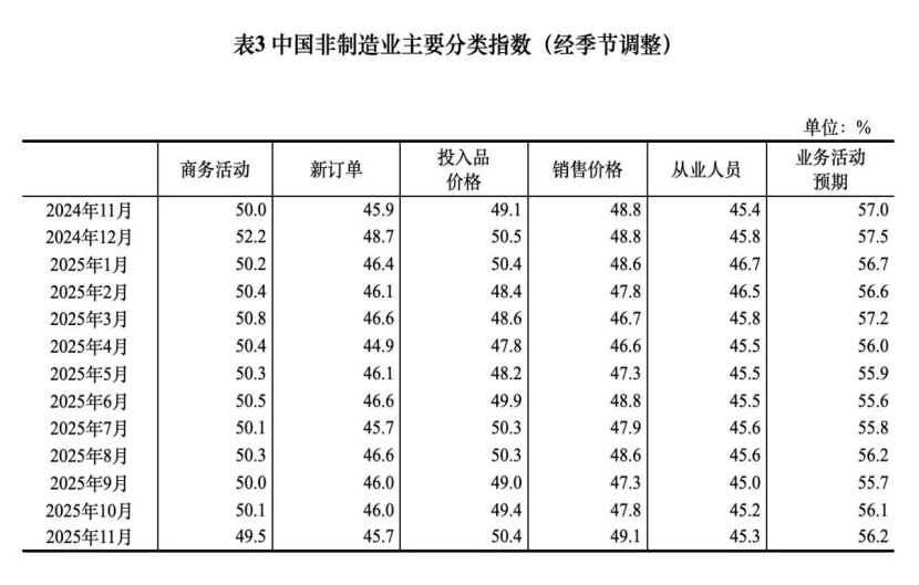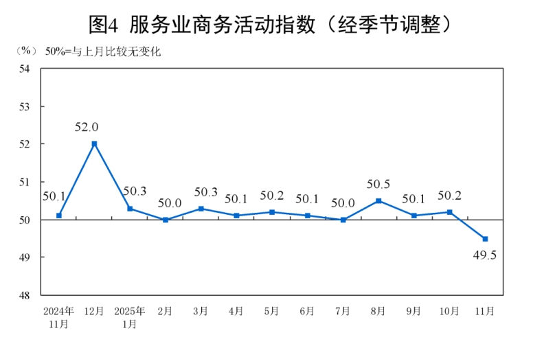 11月份,非制造业商务活动指数为49.5%,比上月下降0.6个百分点。